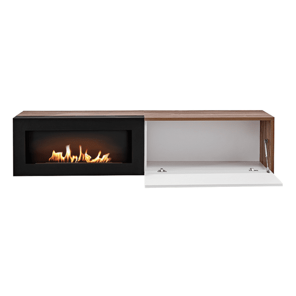 1x TV stand: on the left side there is a biofireplace. On the right side there is a flap, behind it there is one space. “Push-click” opening system. – (HxWxD: 40x180x40)