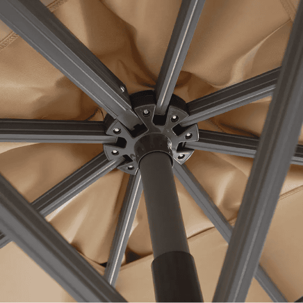 Эта большая модель зонта для патио обеспечивает высочайшую устойчивость к ветру. Металлическое крестообразное основание зонта обеспечивает прочность и устойчивость в ветреную погоду, однако для обеспечения более лучшей устойчивости необходимы утяжелители, которые можно приобрести отдельно. Вес зонта 21,5 кг.
